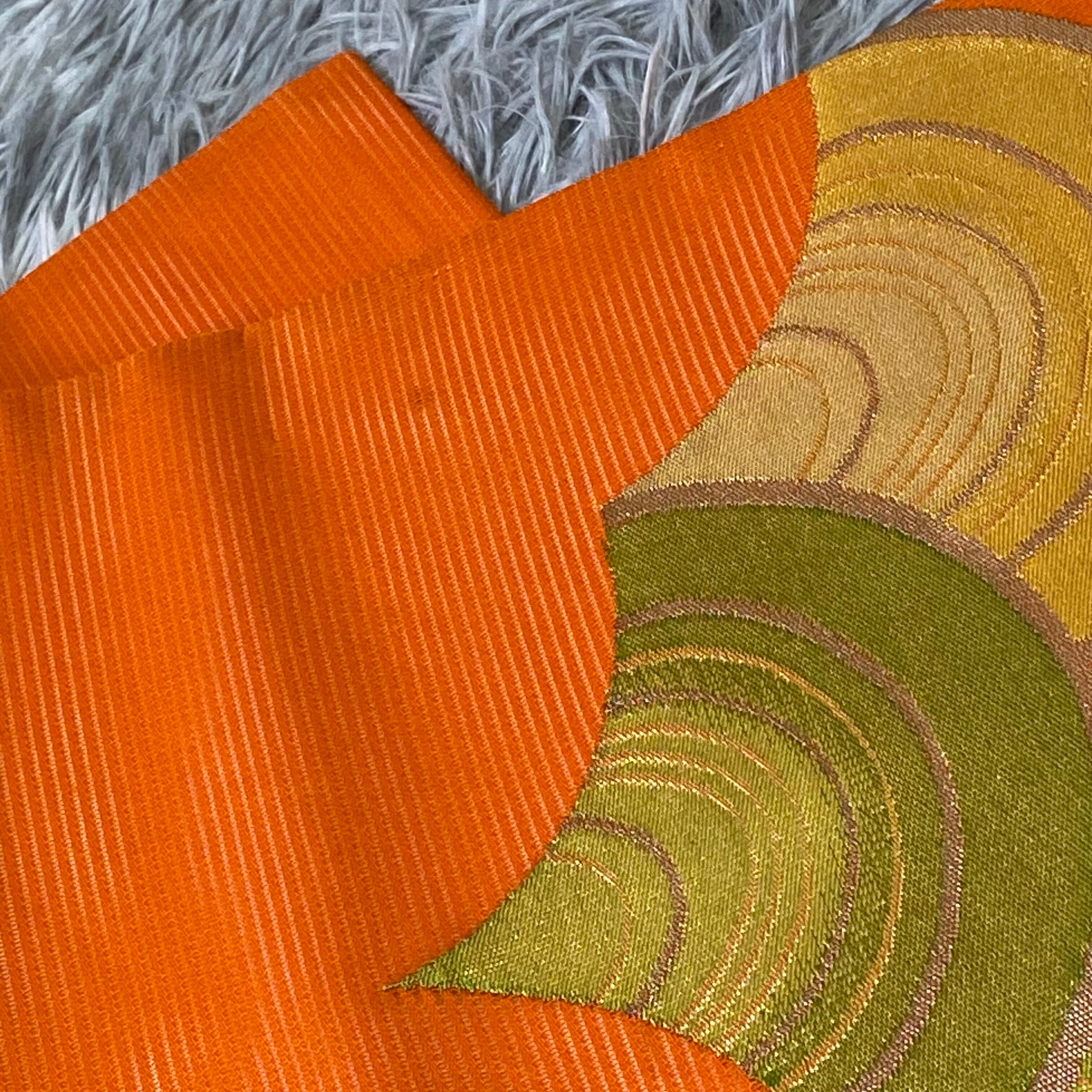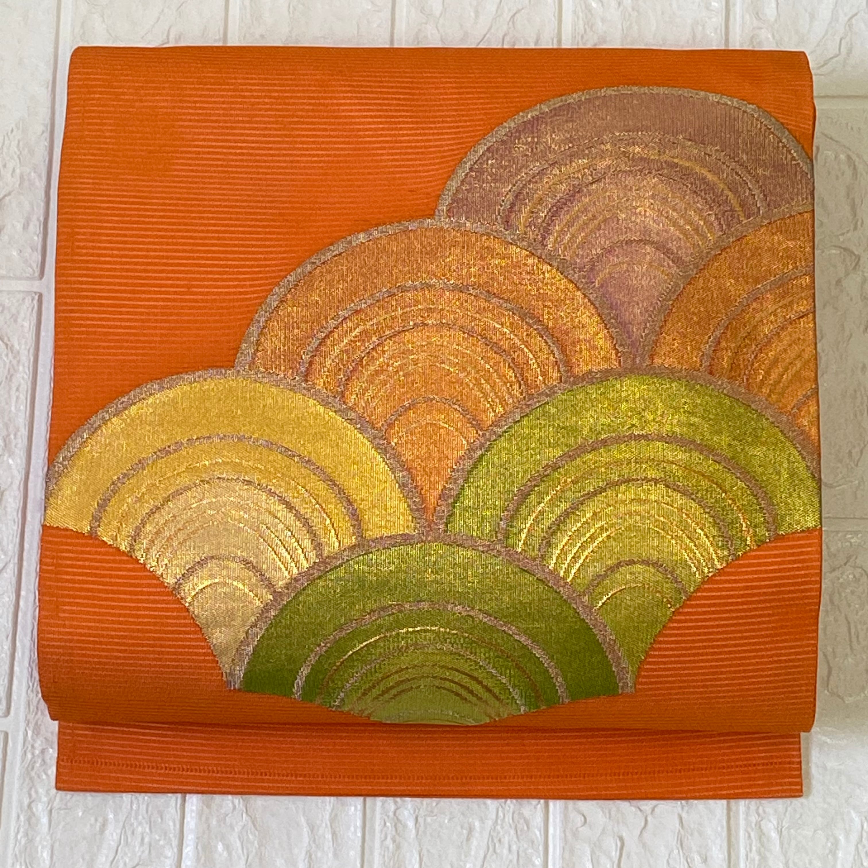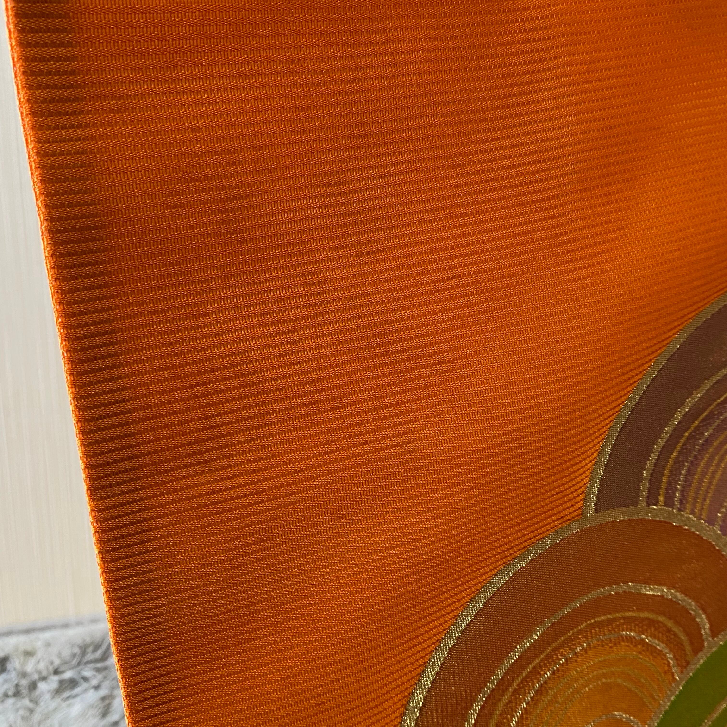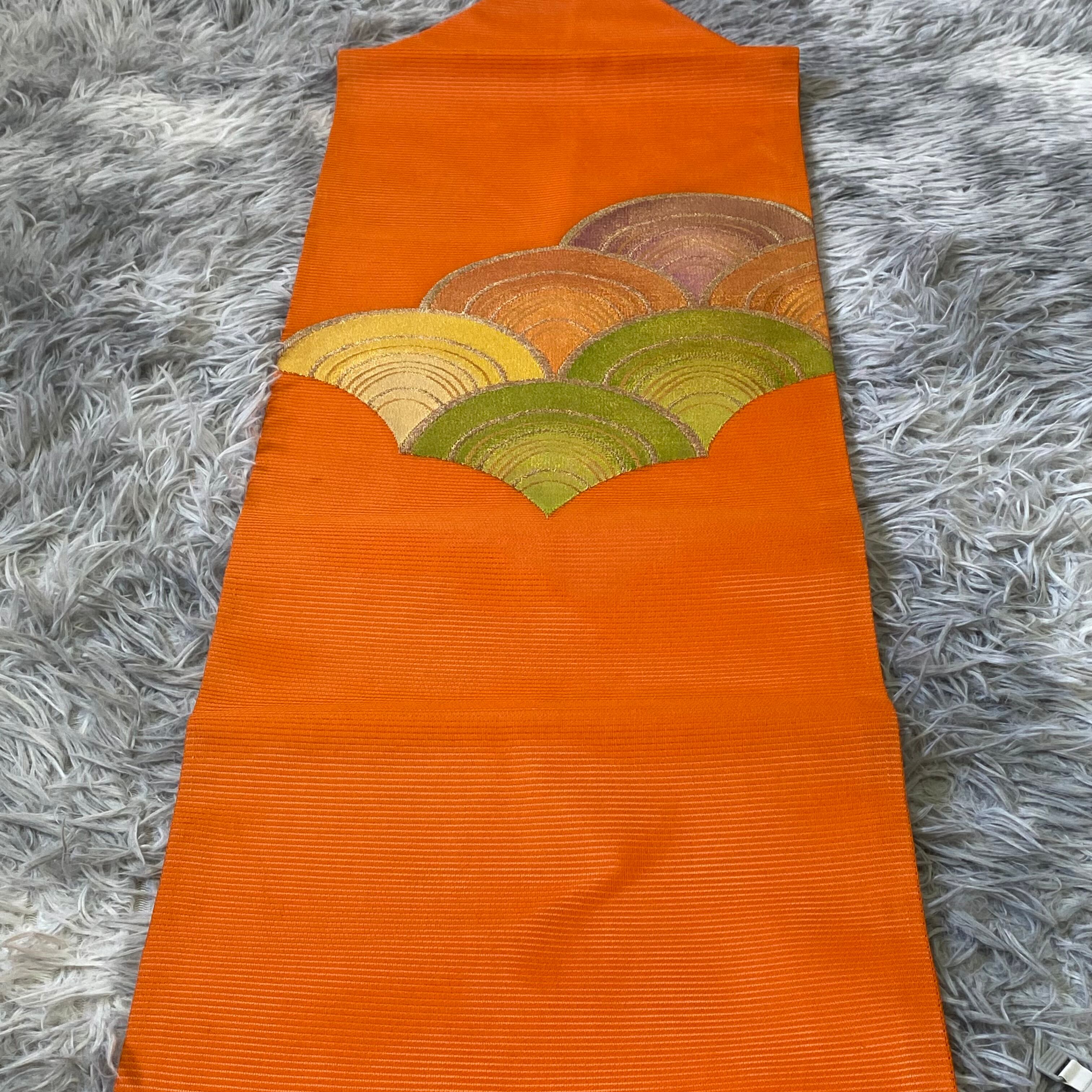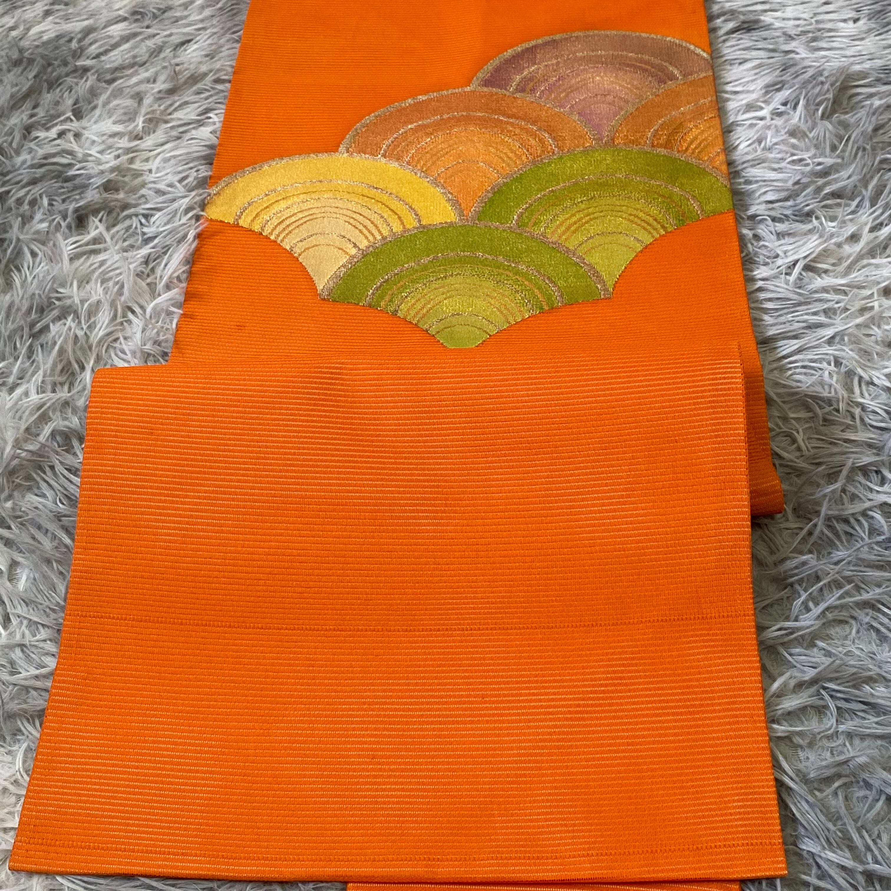 希少【夏帯 絽】九寸名古屋帯 扇文様 青海波風 橙色 夏着物 アンティーク着物