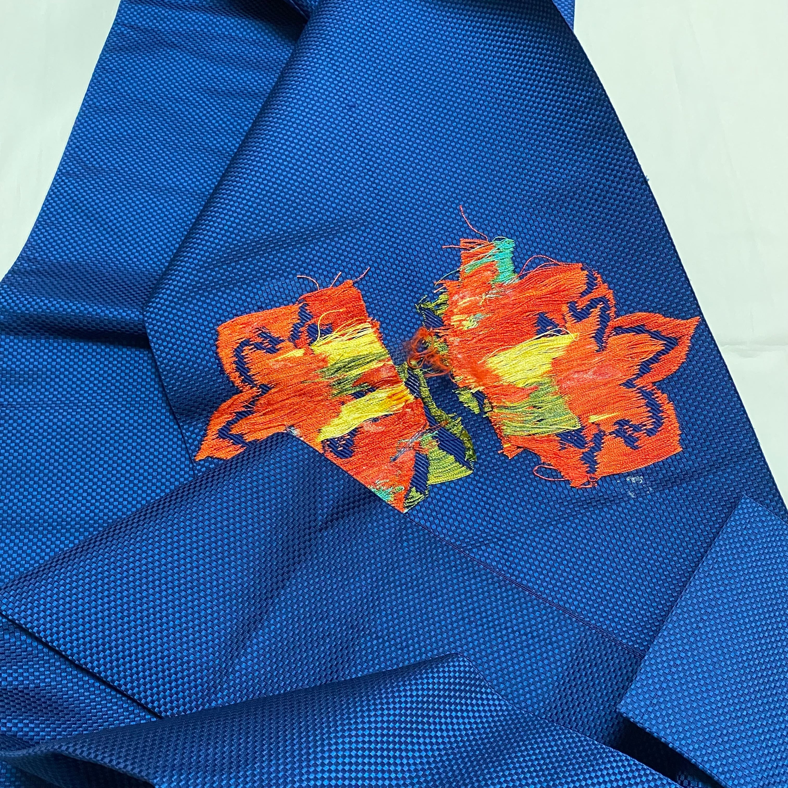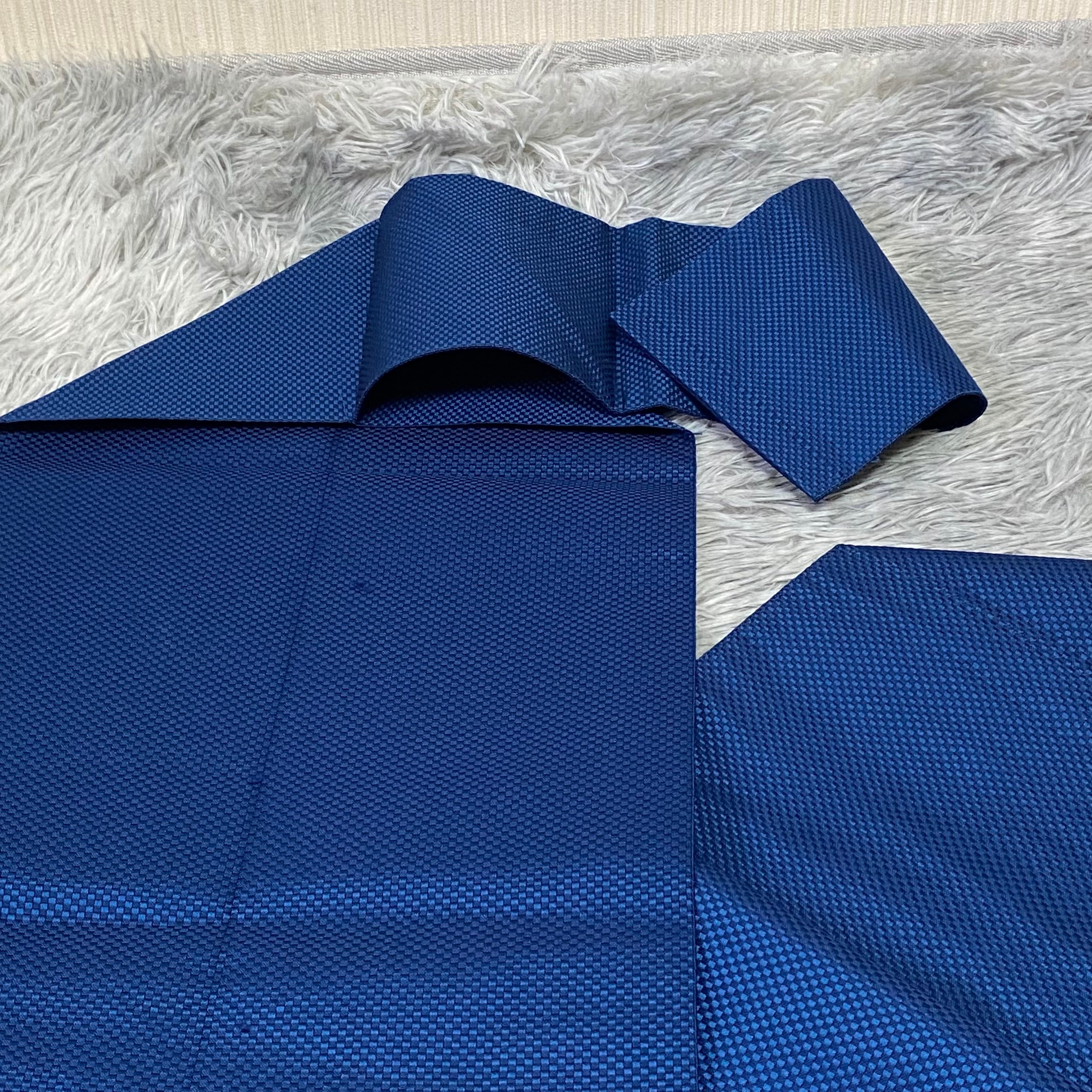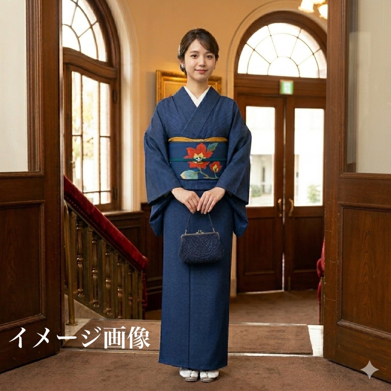同系色の紺やブルー系の着物に合わせて。松葉仕立てを活かして前幅を少し広めに作れば、モデルのような存在感のある装いになります✨️