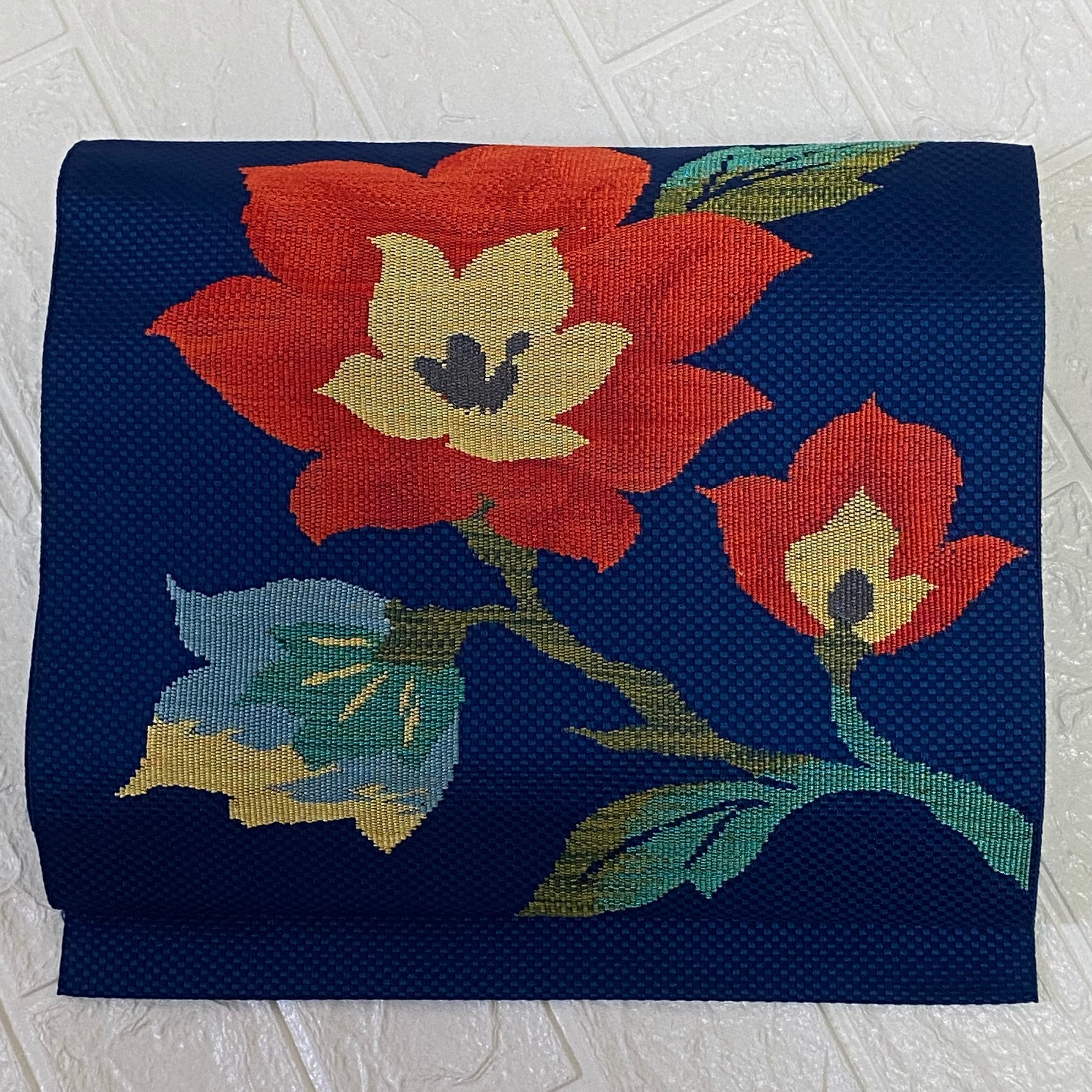 名古屋帯【西陣織 じゅらく】八寸帯 花模様 カジュアル 高級品 モダン レトロ