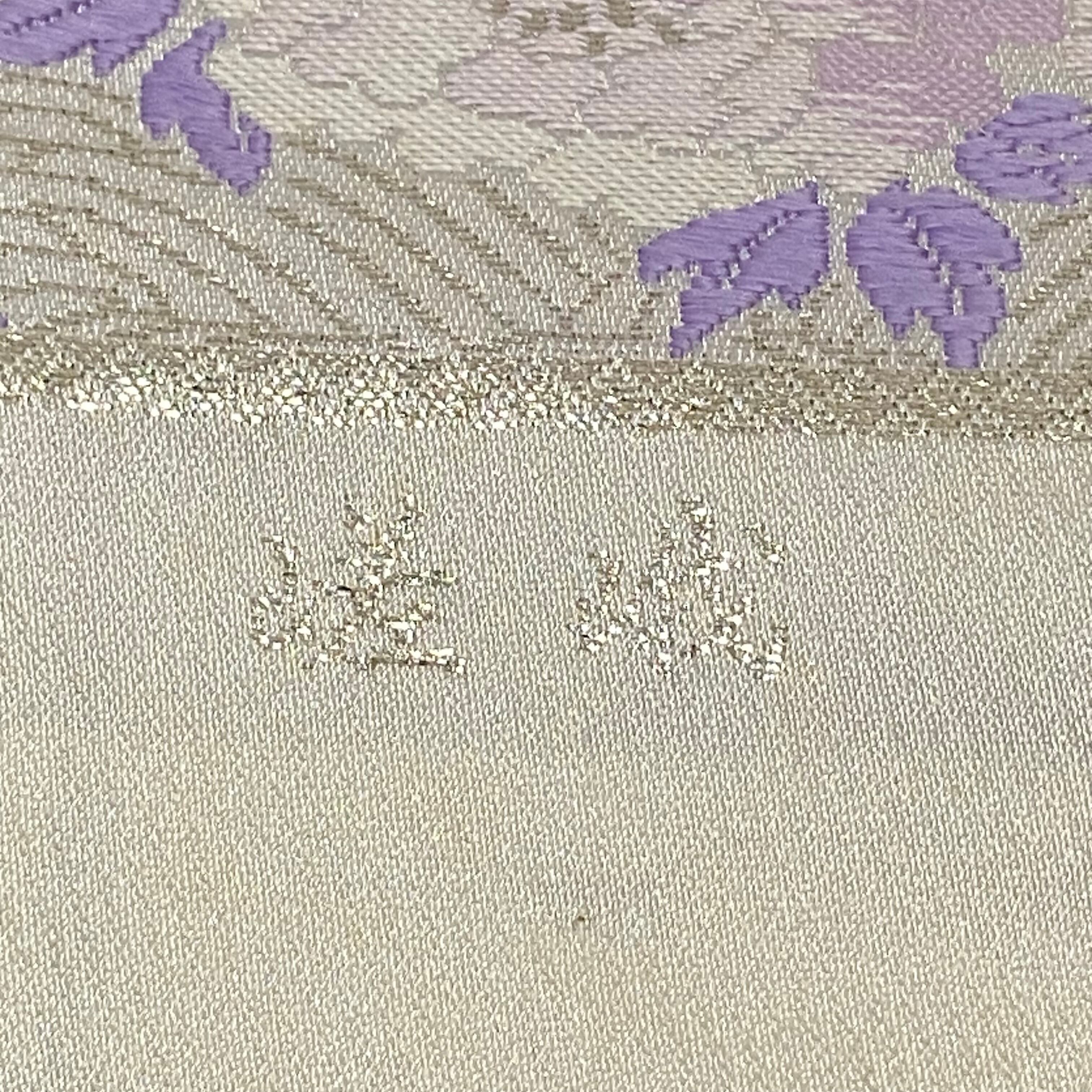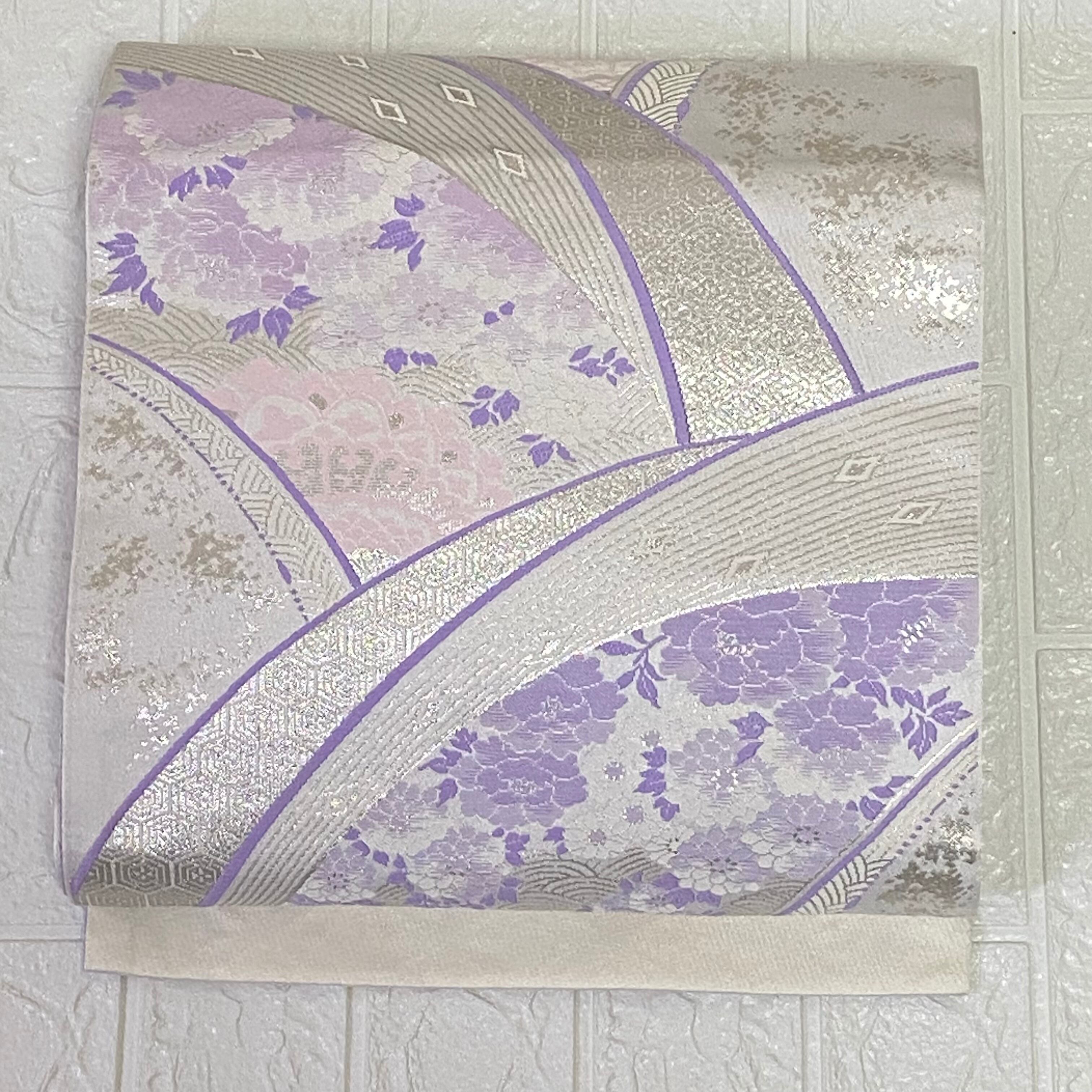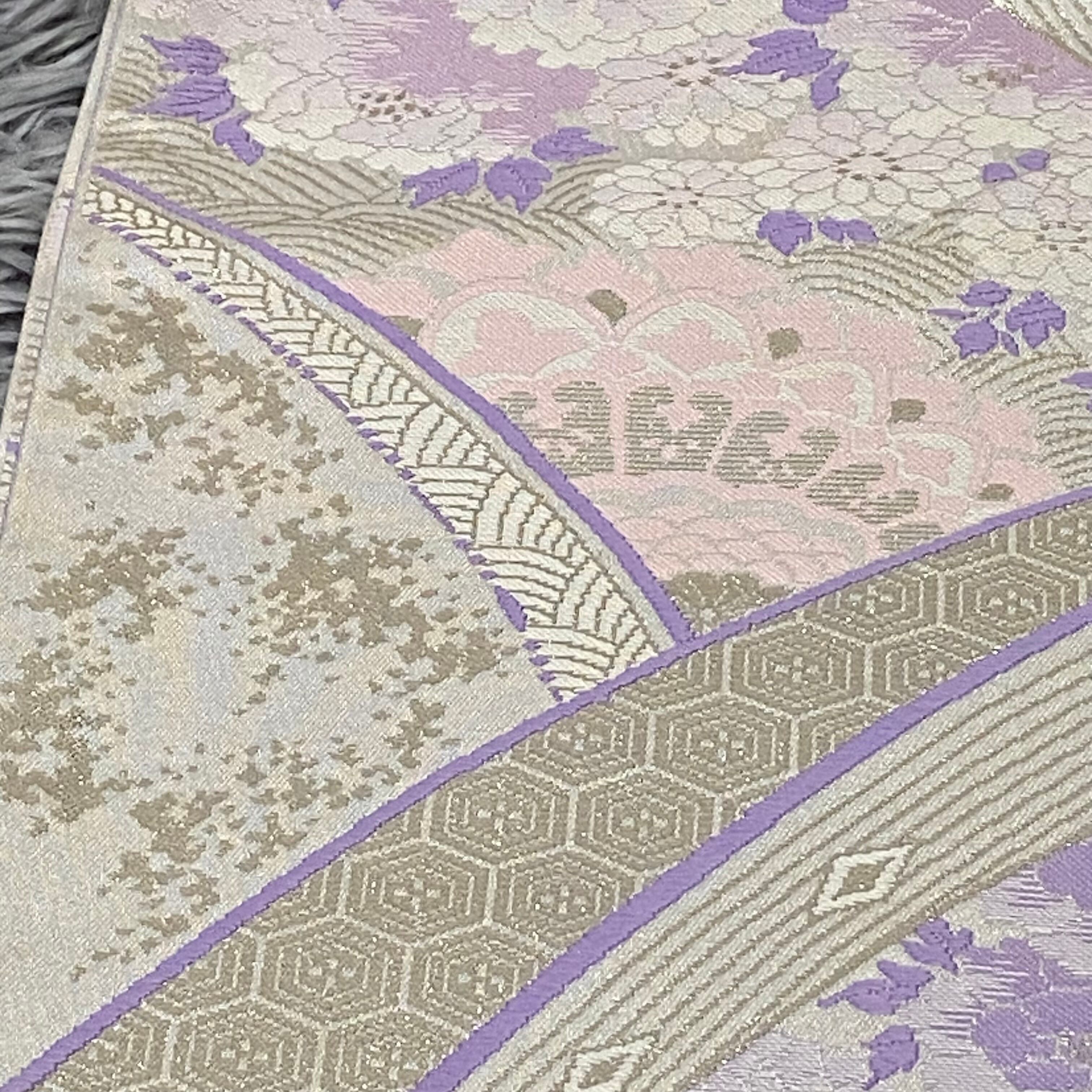 美品 袋帯 リバーシブル 嵯峨 落款あり 辻が花 麻の葉 薄紫 銀色 高級袋帯