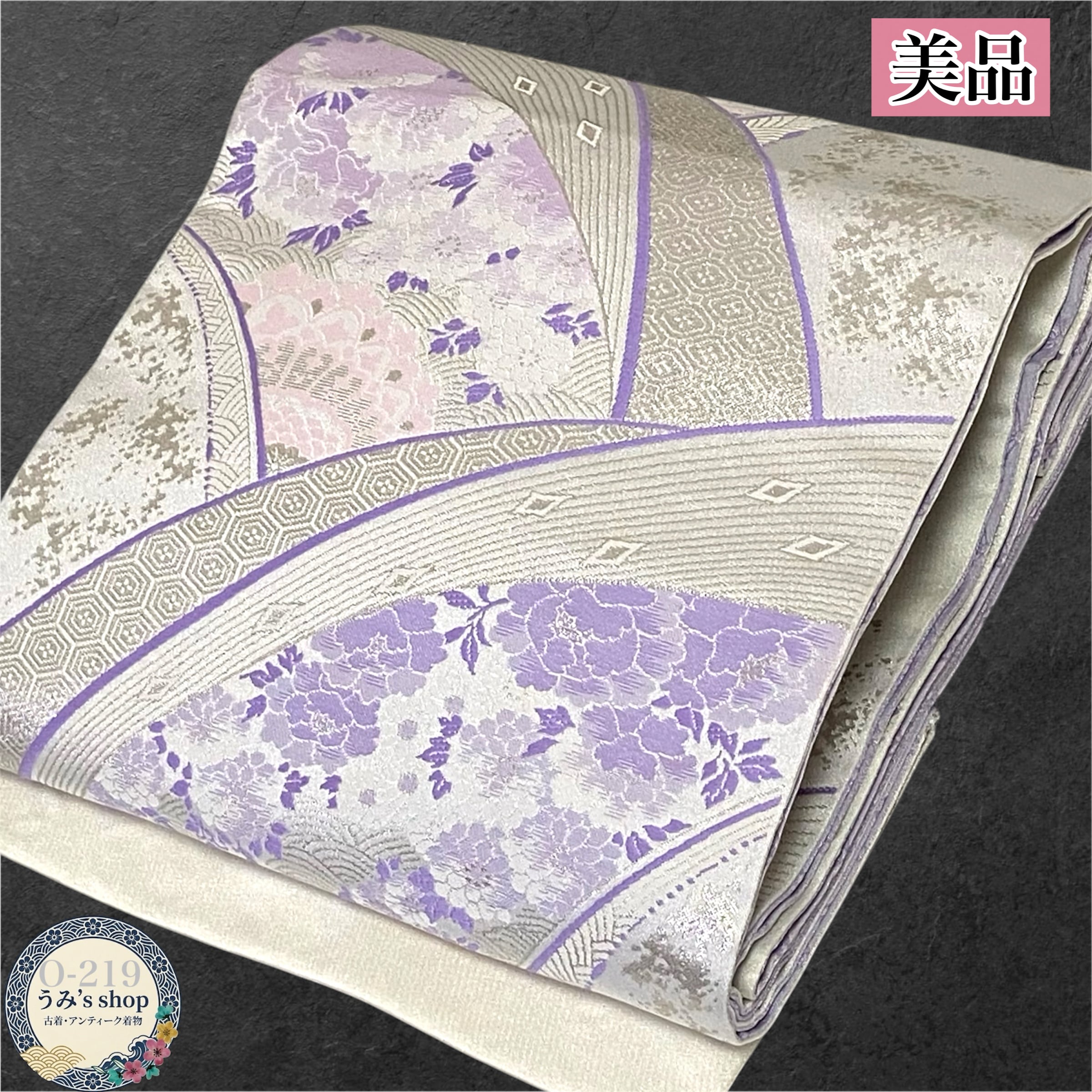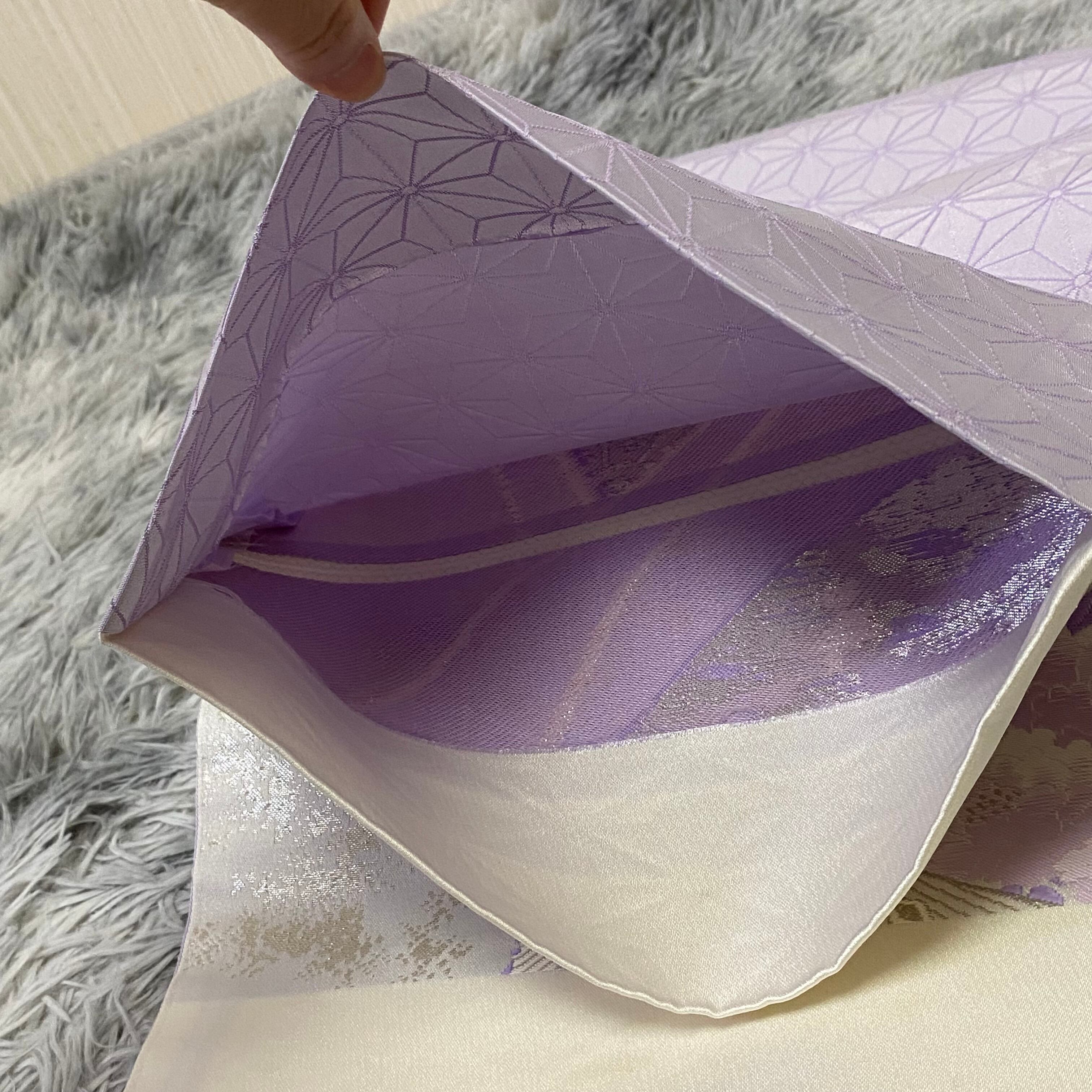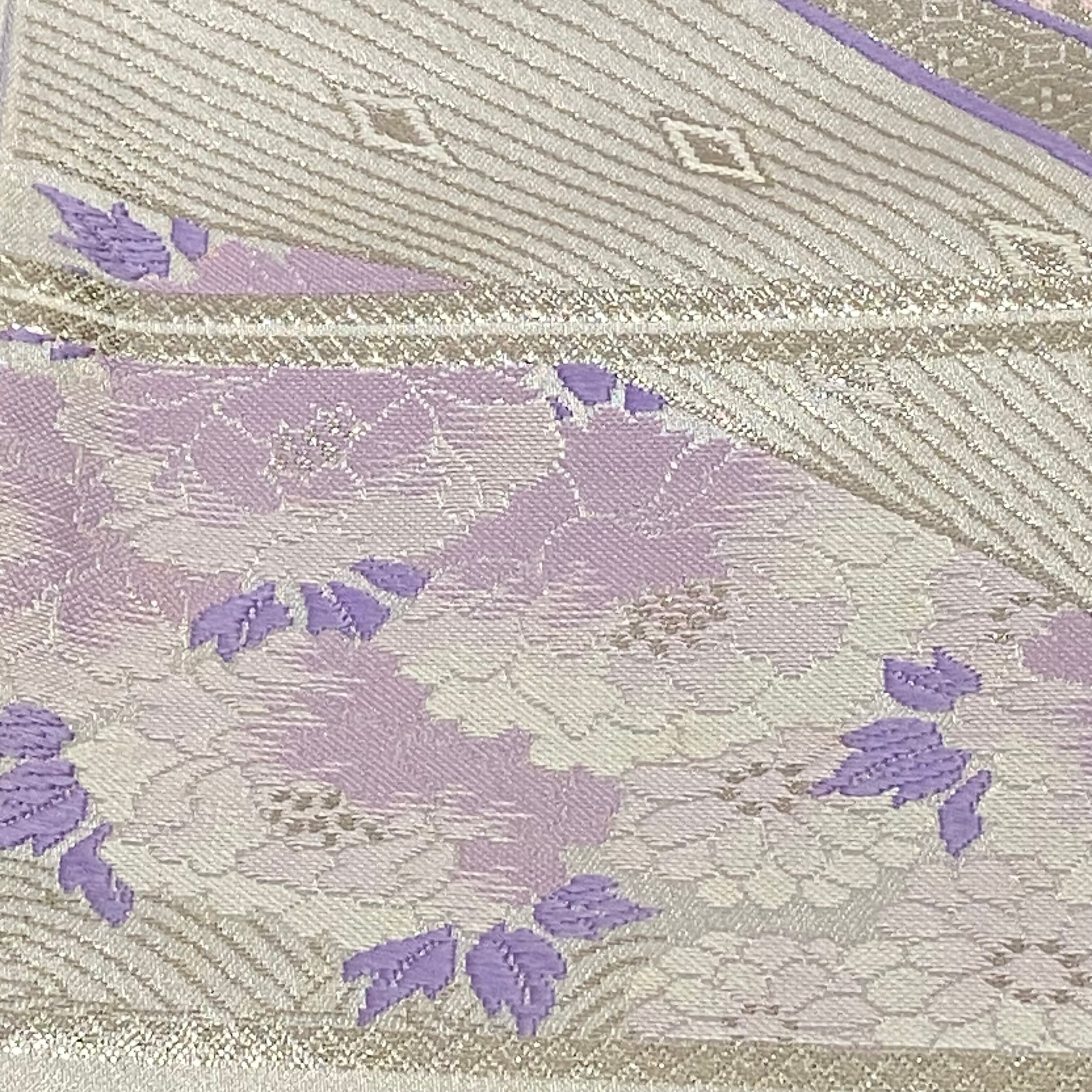 美品 袋帯 リバーシブル 嵯峨 落款あり 辻が花 麻の葉 薄紫 銀色 高級袋帯