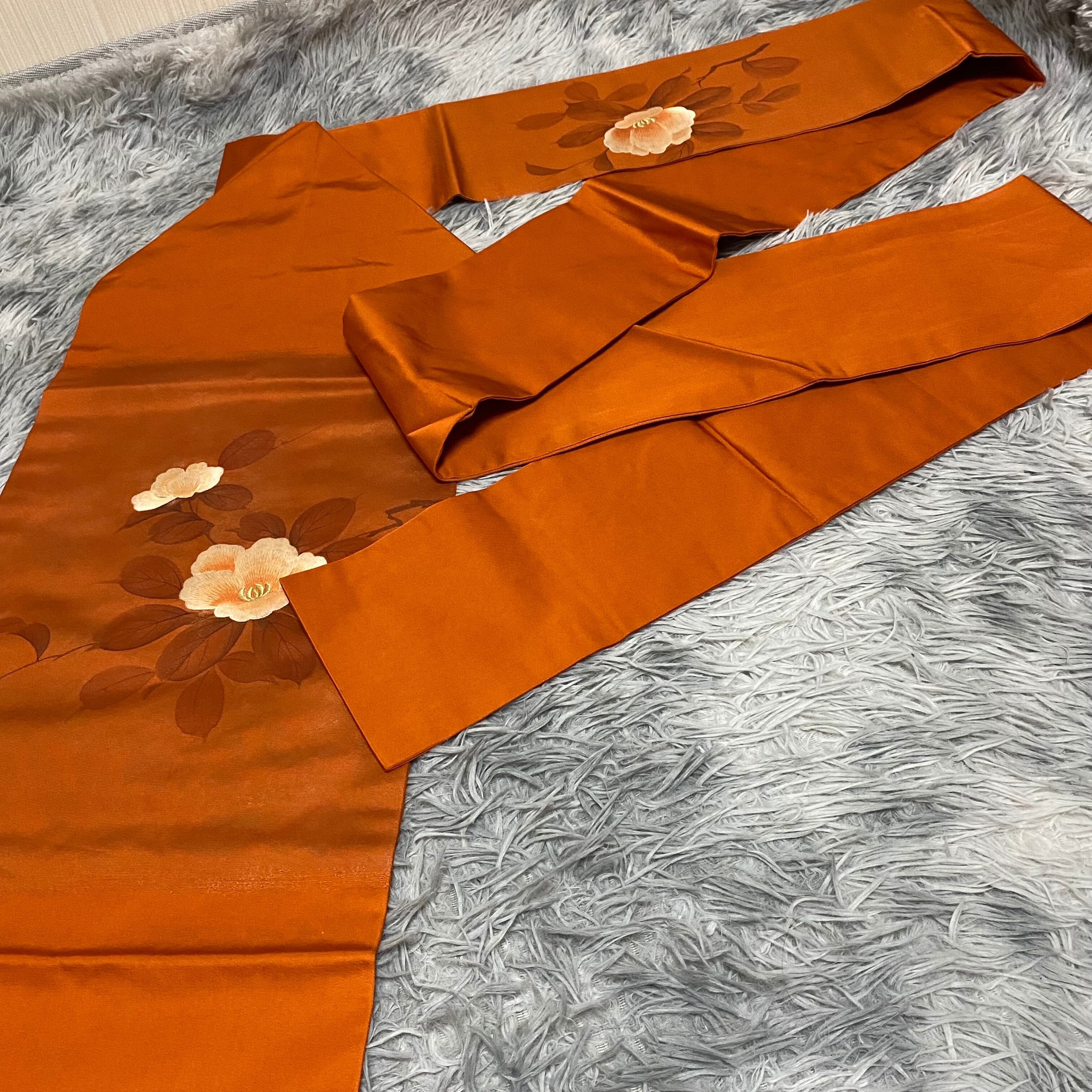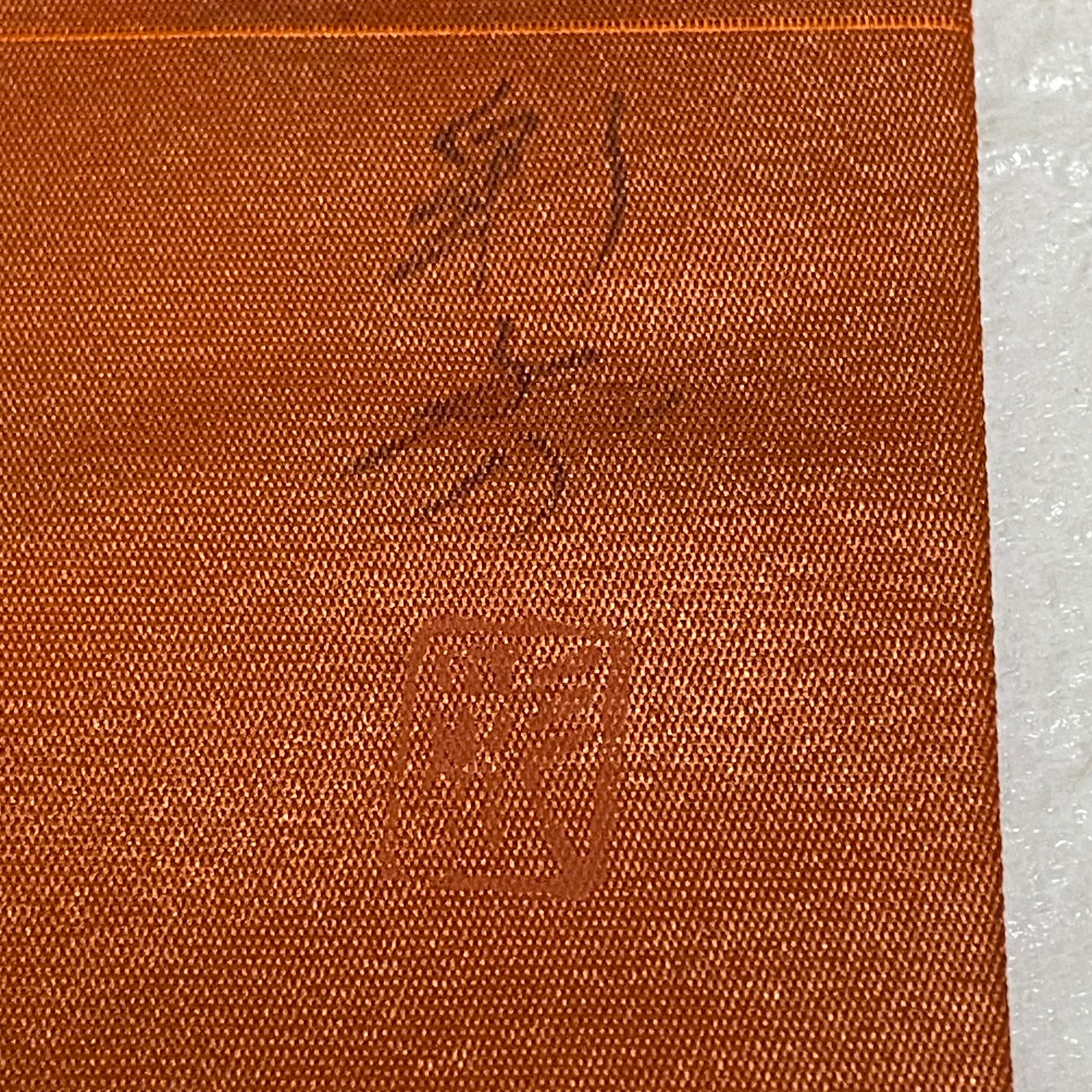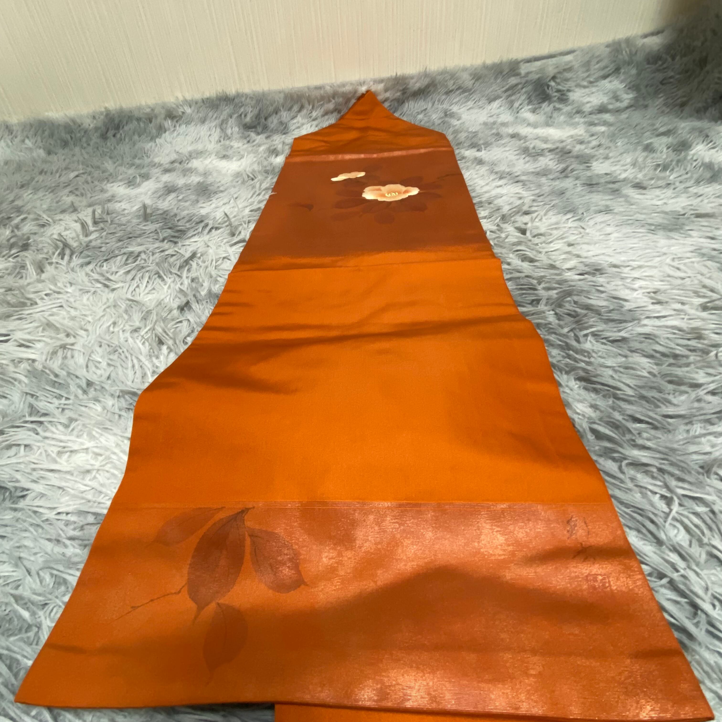 名古屋帯 八寸帯 落款あり 花柄 椿 手描き友禅 刺繍 代赭色 昭和レトロ 和装